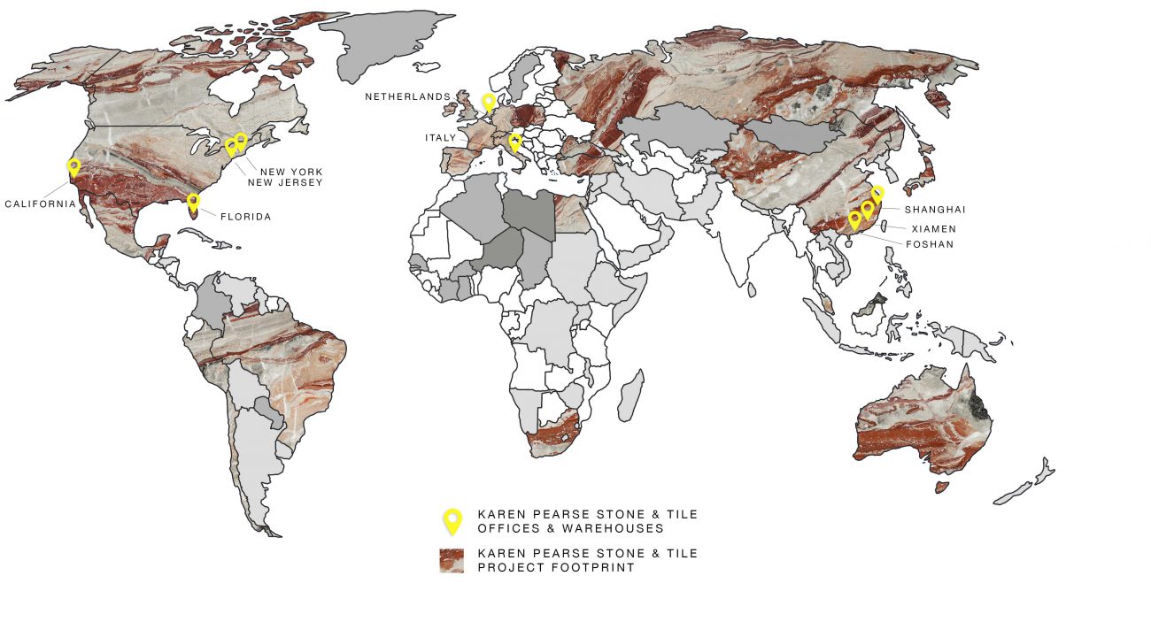 To date, Karen Pearse Stone and Architectural Surfaces has worked with some of the world’s most prominent retailers, architects and developers in forty countries. Headquartered in New York City – Karen Pearse Stone and Architectural Surfaces has offices in Europe and Asia. Our steadfast global supplier and manufacturer network make it possible for us to deliver elegant, fast, responsible and cost effective materials solutions. Everyday we help our clients meet their project design, budget and construction schedule requirements.
